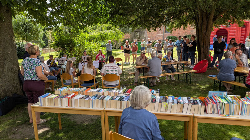 Aufgrund der schönen Wetterlage an diesem Tag, hat sich das gesamte Sommerfest locker im Bereich zwischen Kirche und Gemeindehaus im Freien entfaltet und die Mitglieder unseres Posaunenchores habe uns währenddessen von ihrem Schattenplatz unter den Bäumen mit Musik unterhalten.